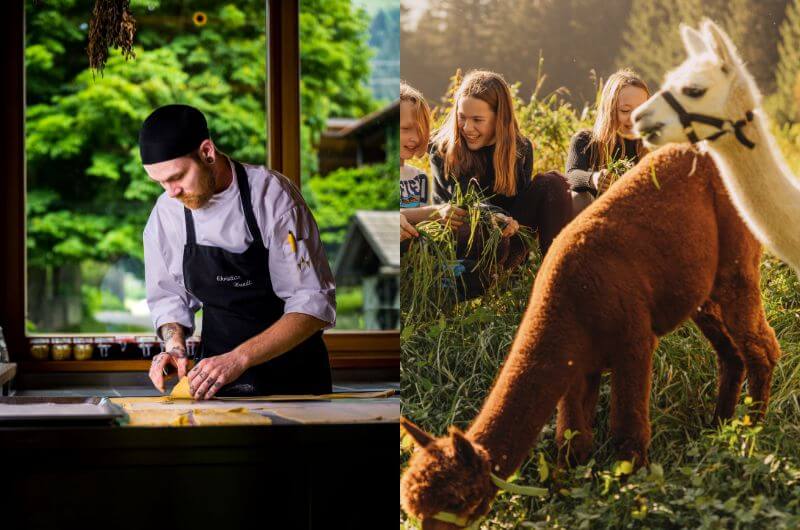 - Kulinarische Verwöhnung: Bestellt euch einen Frühstücks- oder Grill-Korb ins Chalet oder geht zum Gutsherren-Frühstücksbuffet im schmucken Gutshaus. Ein 4-Gänge-Dinner mit innovativer regionaler Bio-Küche gibt's 3x/Woche von Küchenchef Christian. Und Süßes für den Nachmittag!